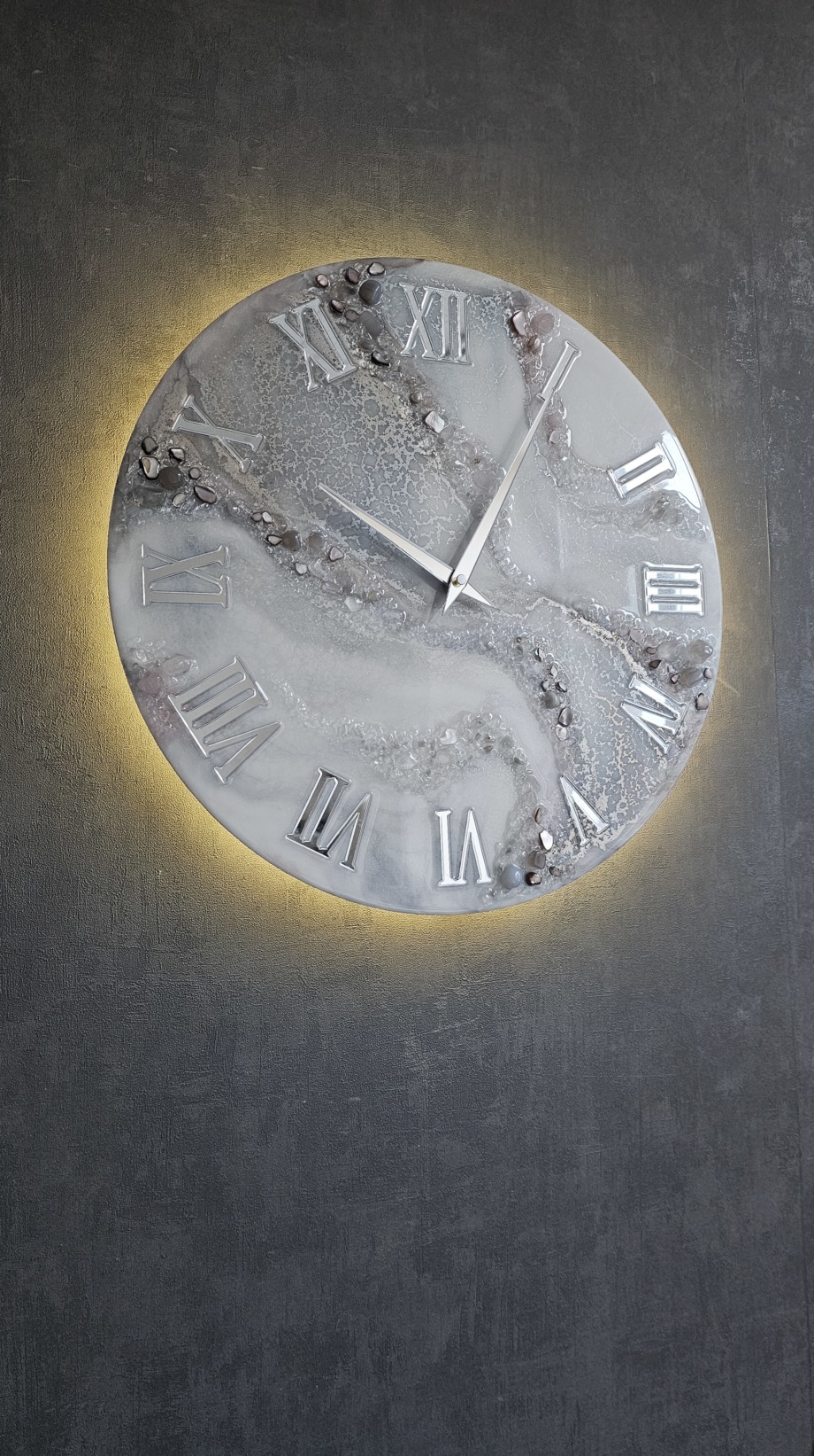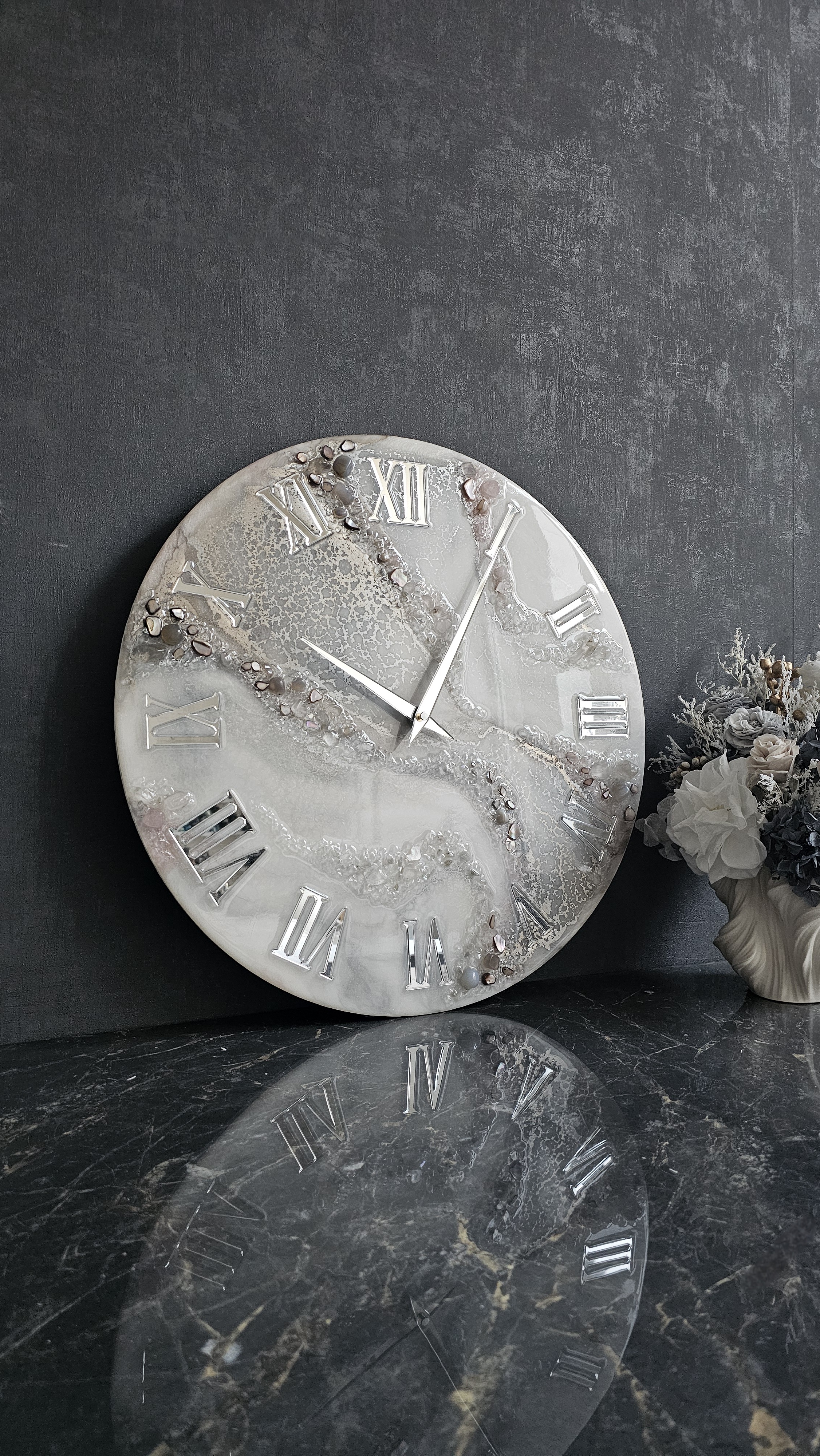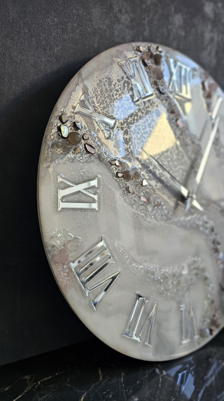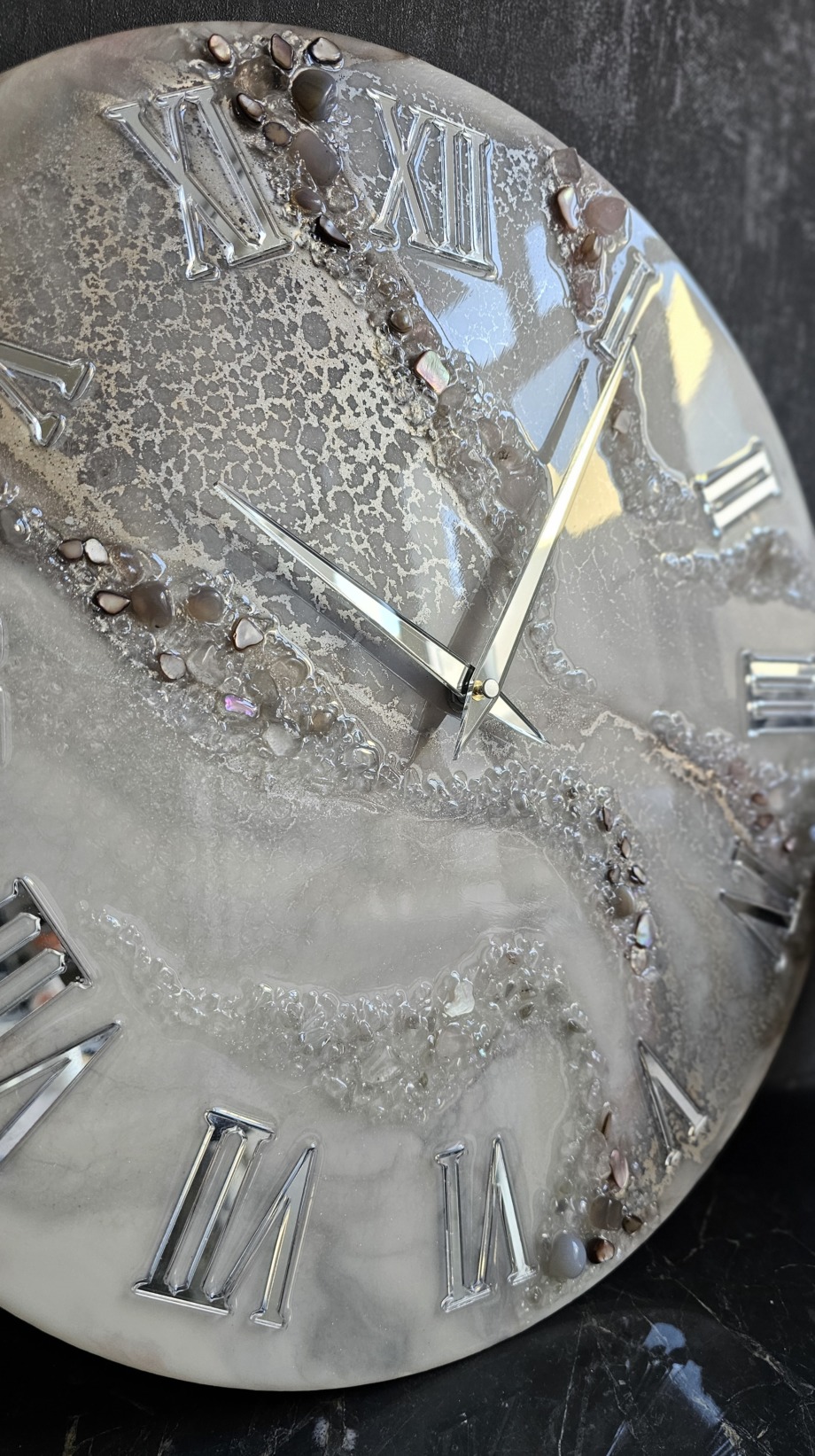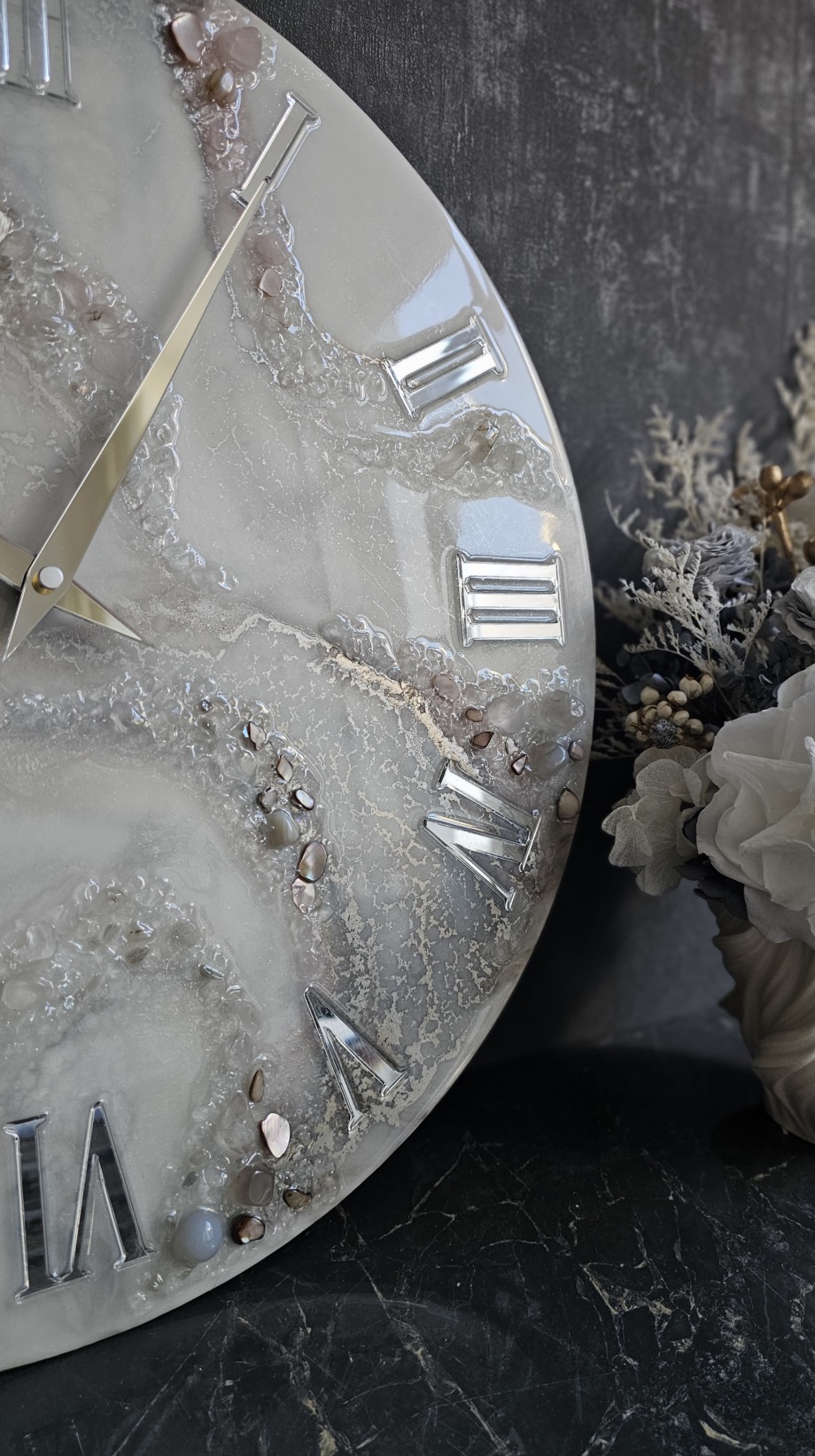 Эти настенные часы — не просто предмет интерьера, а настоящее произведение искусства, созданное вручную из эпоксидной смолы с добавлением натуральных камней. Каждая деталь — от мягких переливов серо-перламутровых оттенков до изысканных металлических римских цифр — говорит о вкусе, утончённости и гармонии.