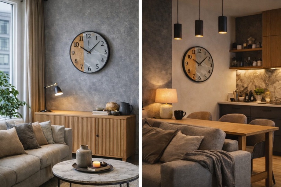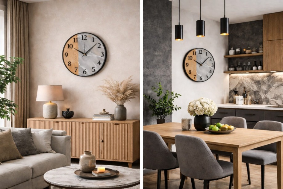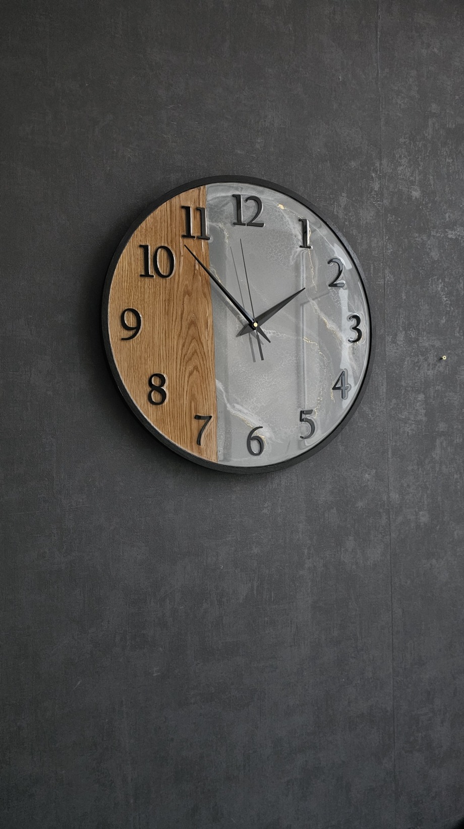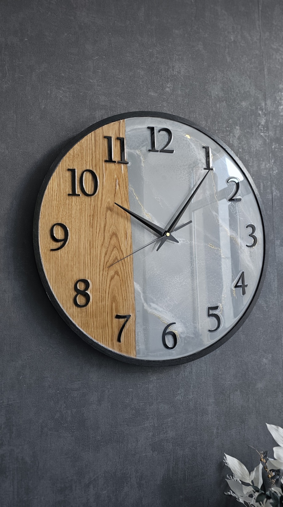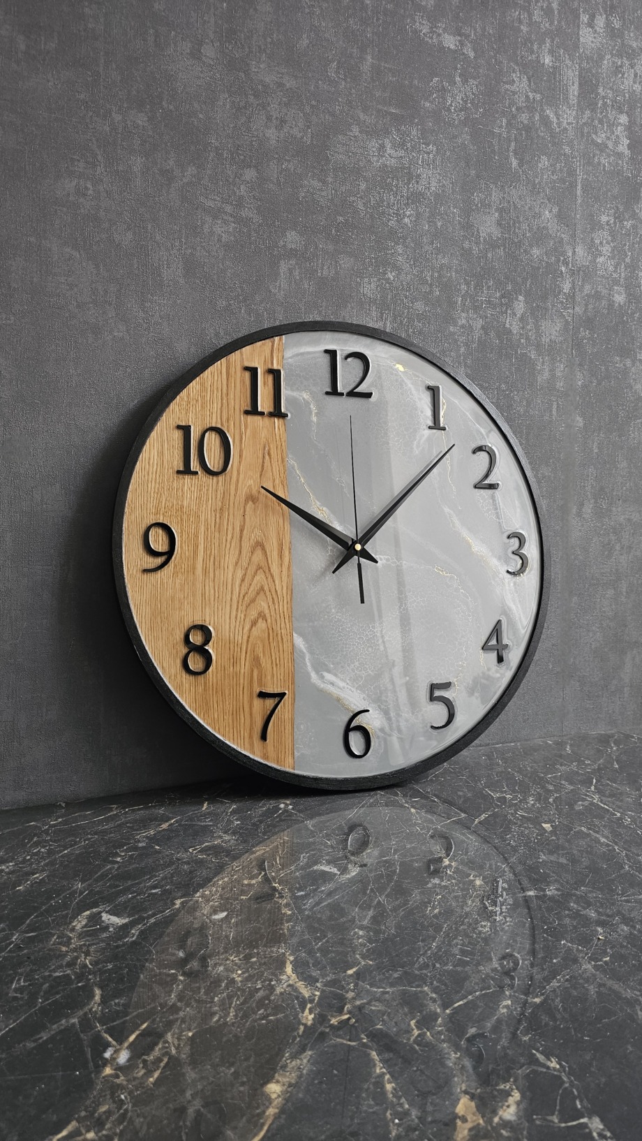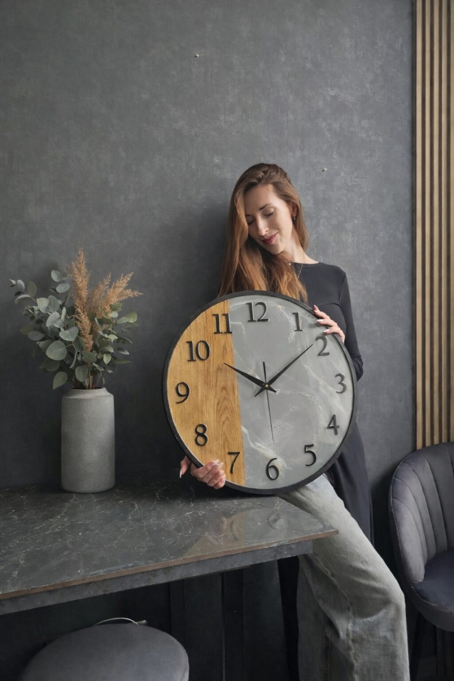 Стильные настенные часы в стиле лофт, сочетающие натуральную текстуру дерева и благородную структуру мрамора. Контраст материалов создаёт современный и выразительный дизайн, который легко становится акцентом в интерьере. Чёрные объёмные цифры и лаконичные стрелки подчёркивают минималистичный характер и делают часы удобными для чтения времени.Диаметр часов — 50 см. Благодаря универсальному дизайну они гармонично впишутся во многие современные интерьеры: лофт, минимализм, современную классику или скандинавский стиль.