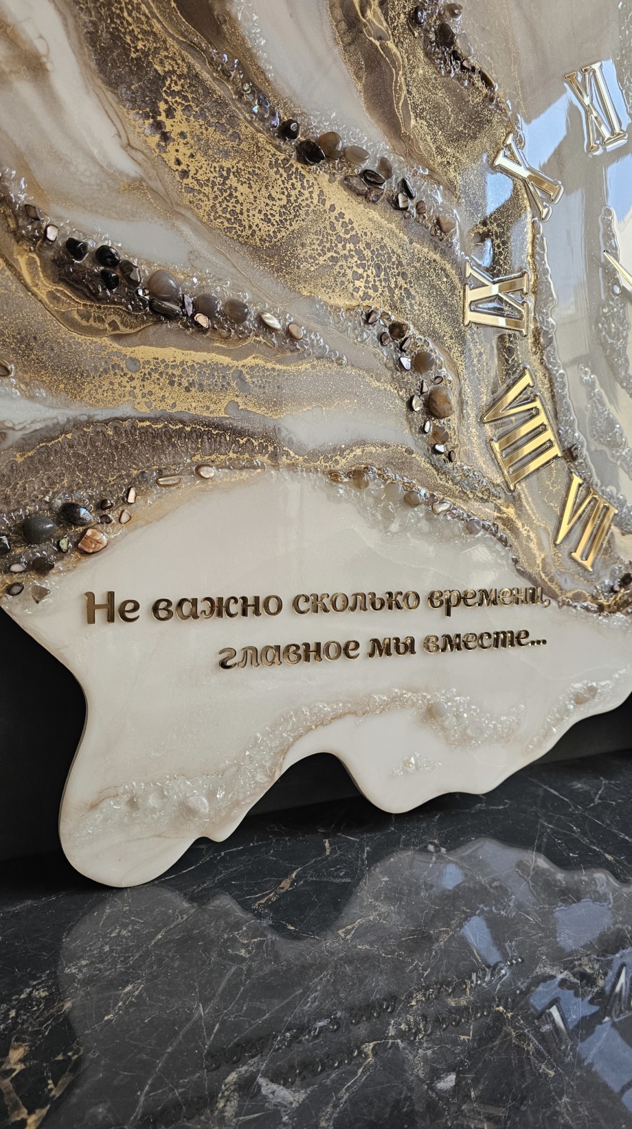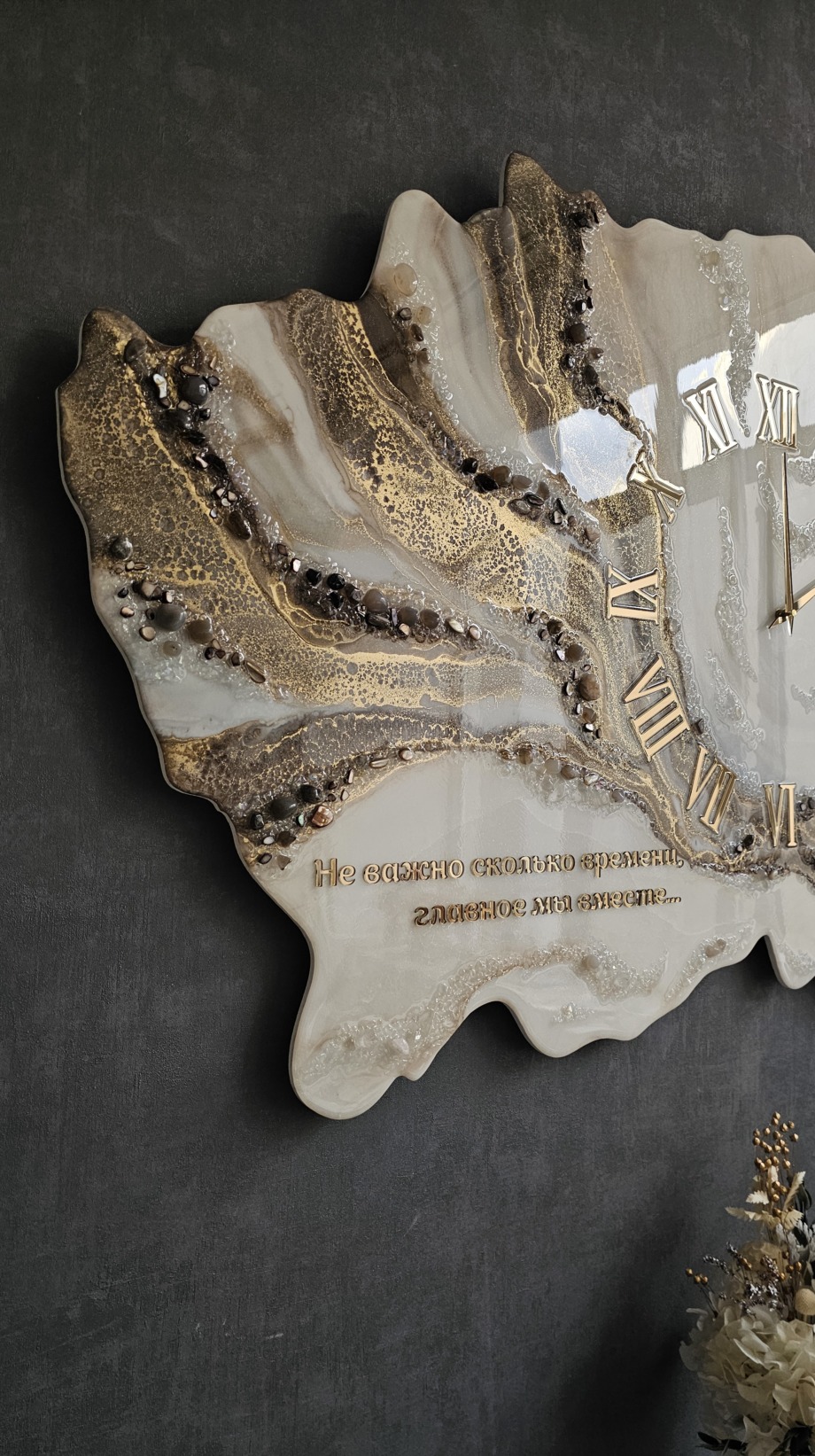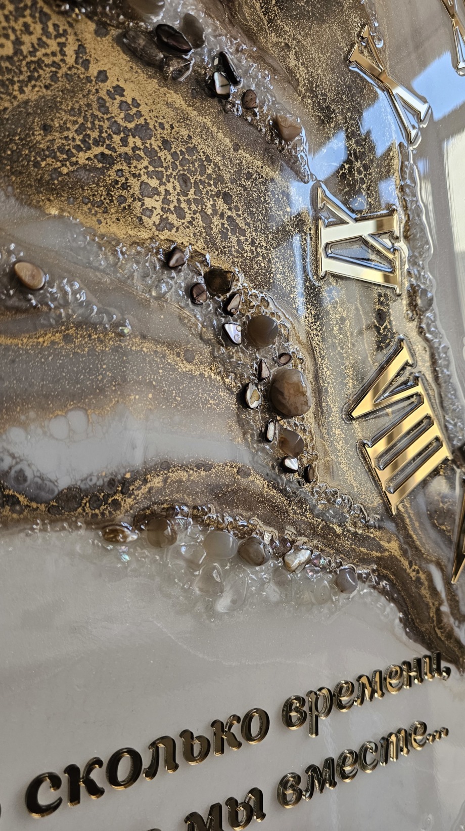 Часы из эпоксидной смолы с натуральными камнями и золотой надписью на память.