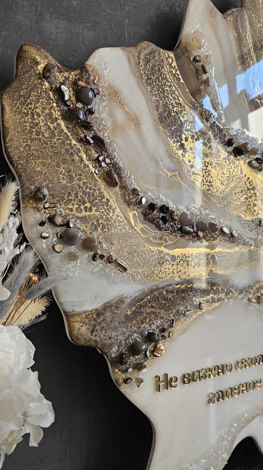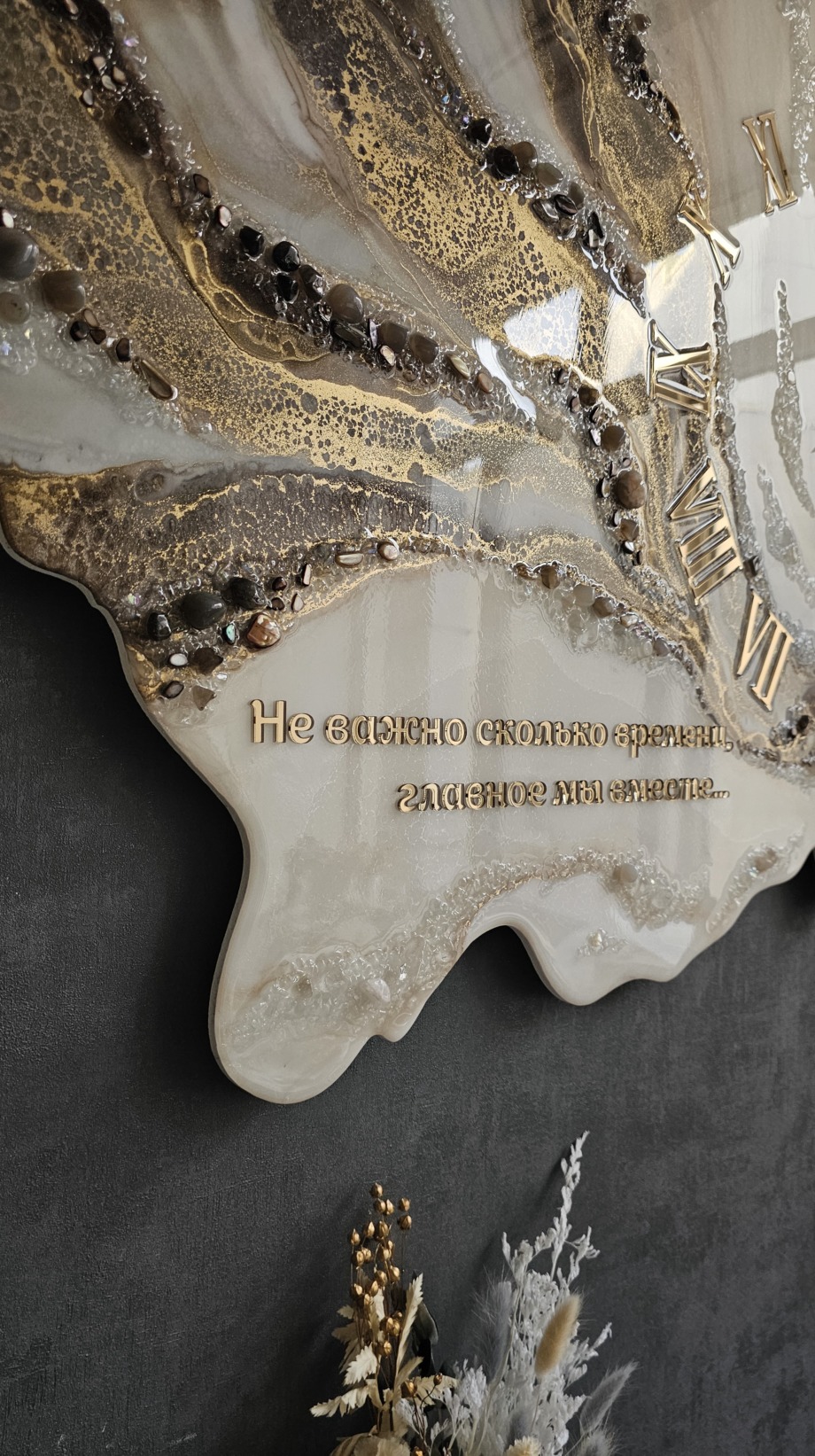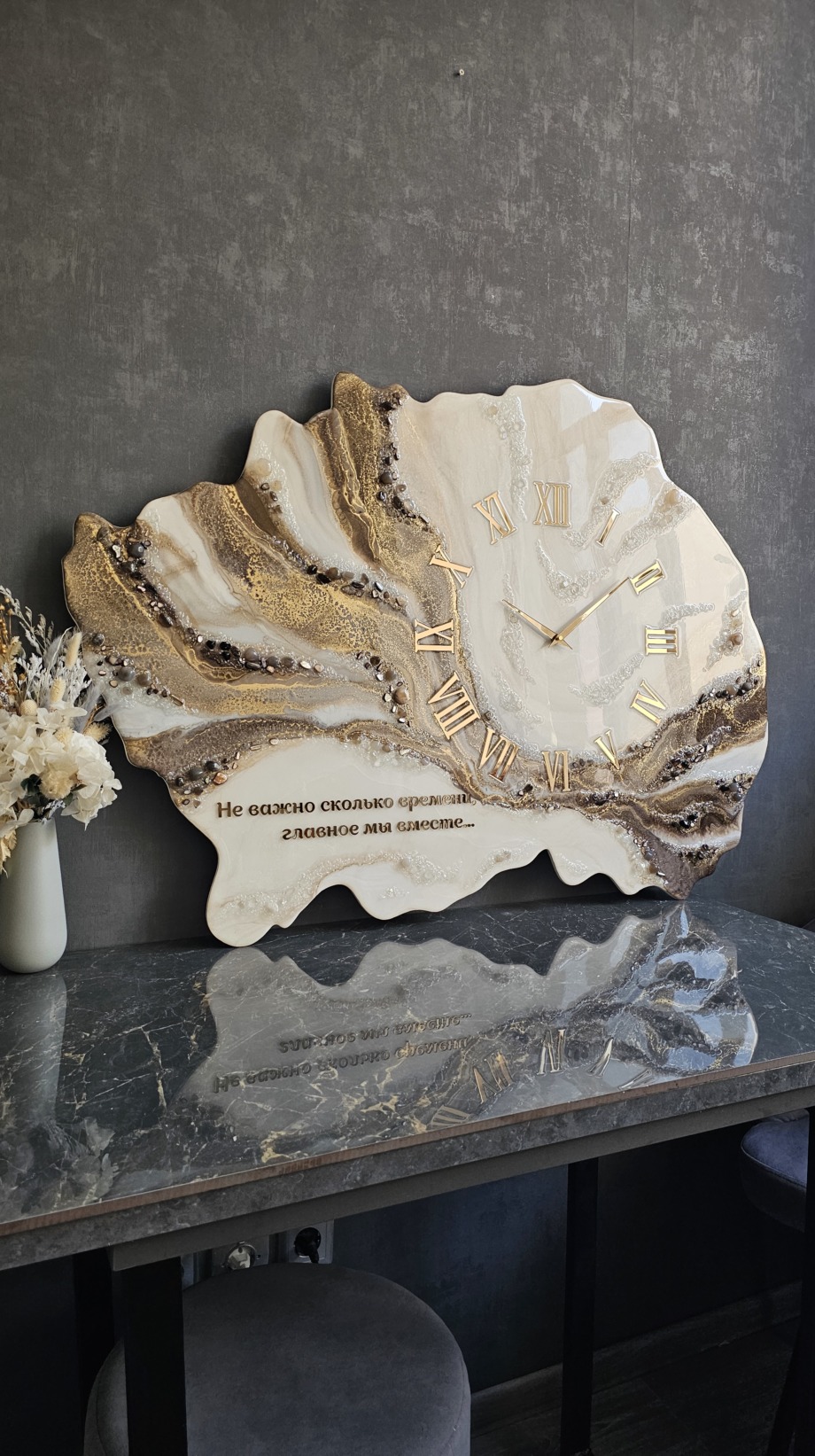 Часы из эпоксидной смолы с натуральными камнями и золотой надписью на память.