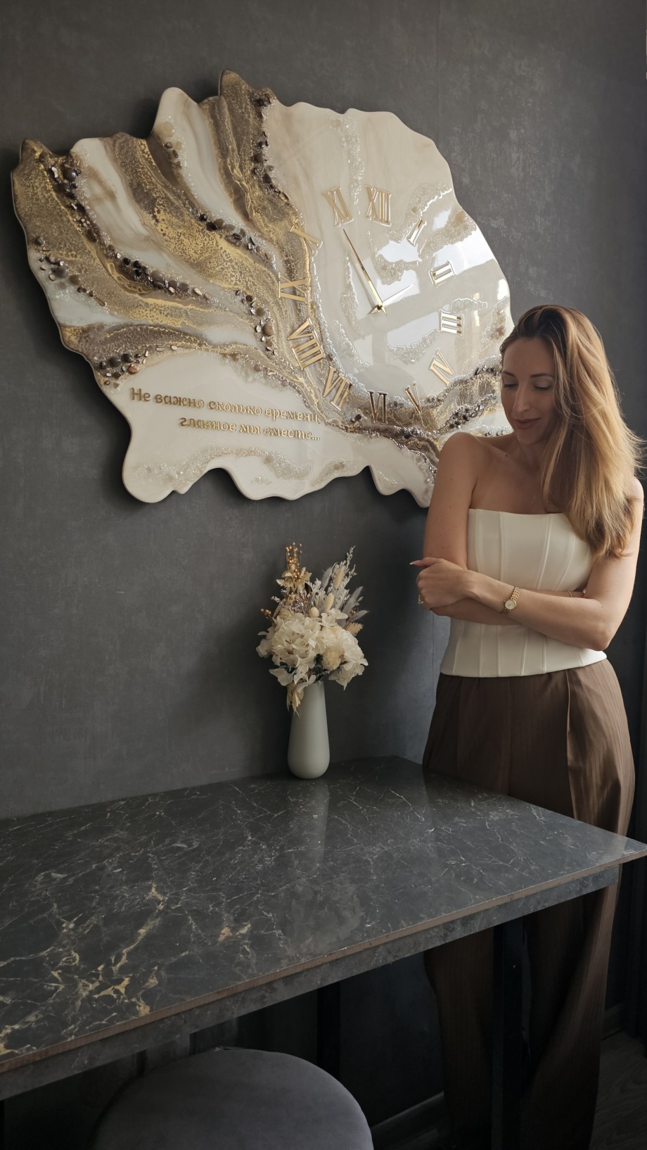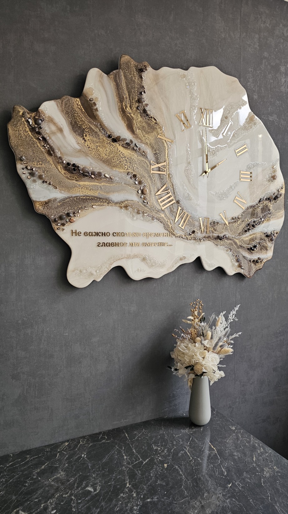 Глубокий смысл: трогательная надпись «Не важно, сколько времени, главное — мы вместе…» превратит часы не просто в элемент декора, а в памятный символ тёплых отношений.