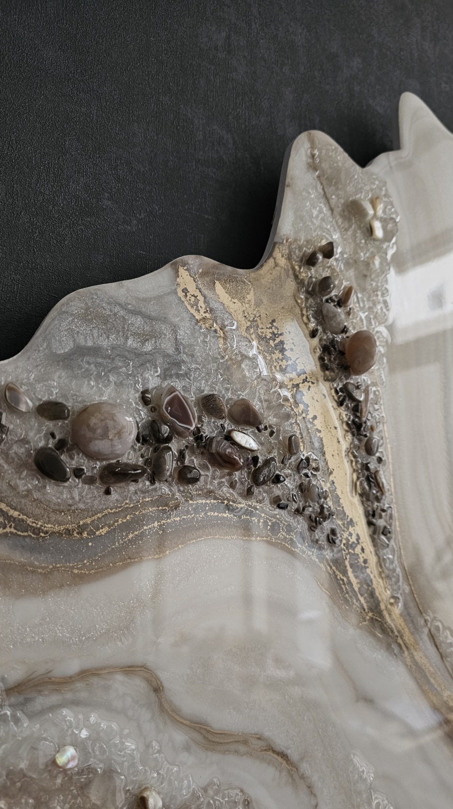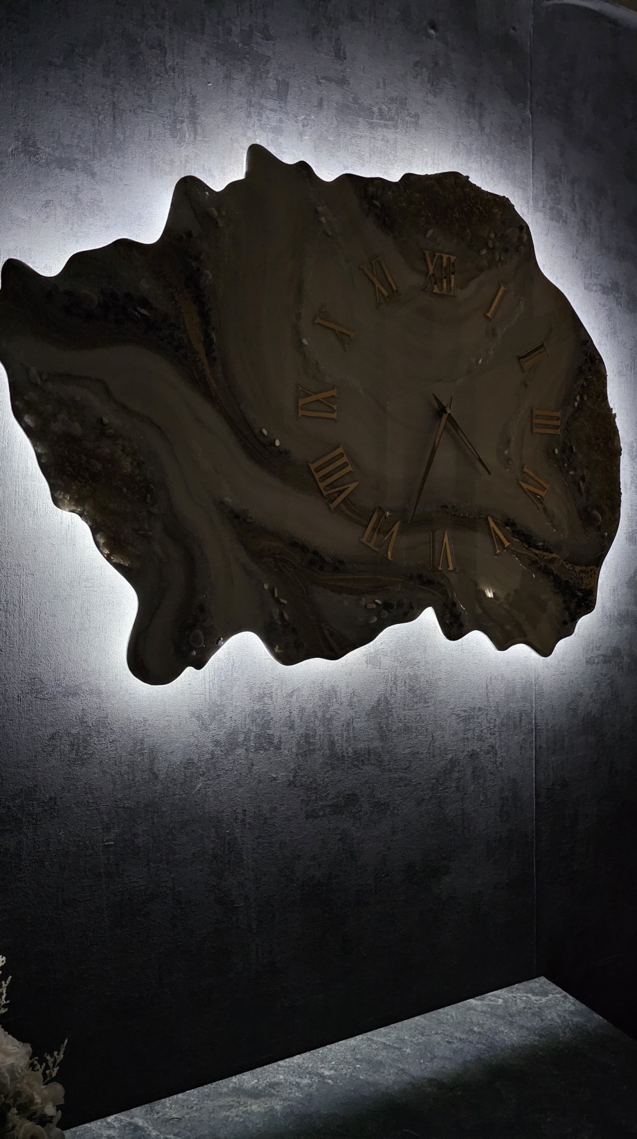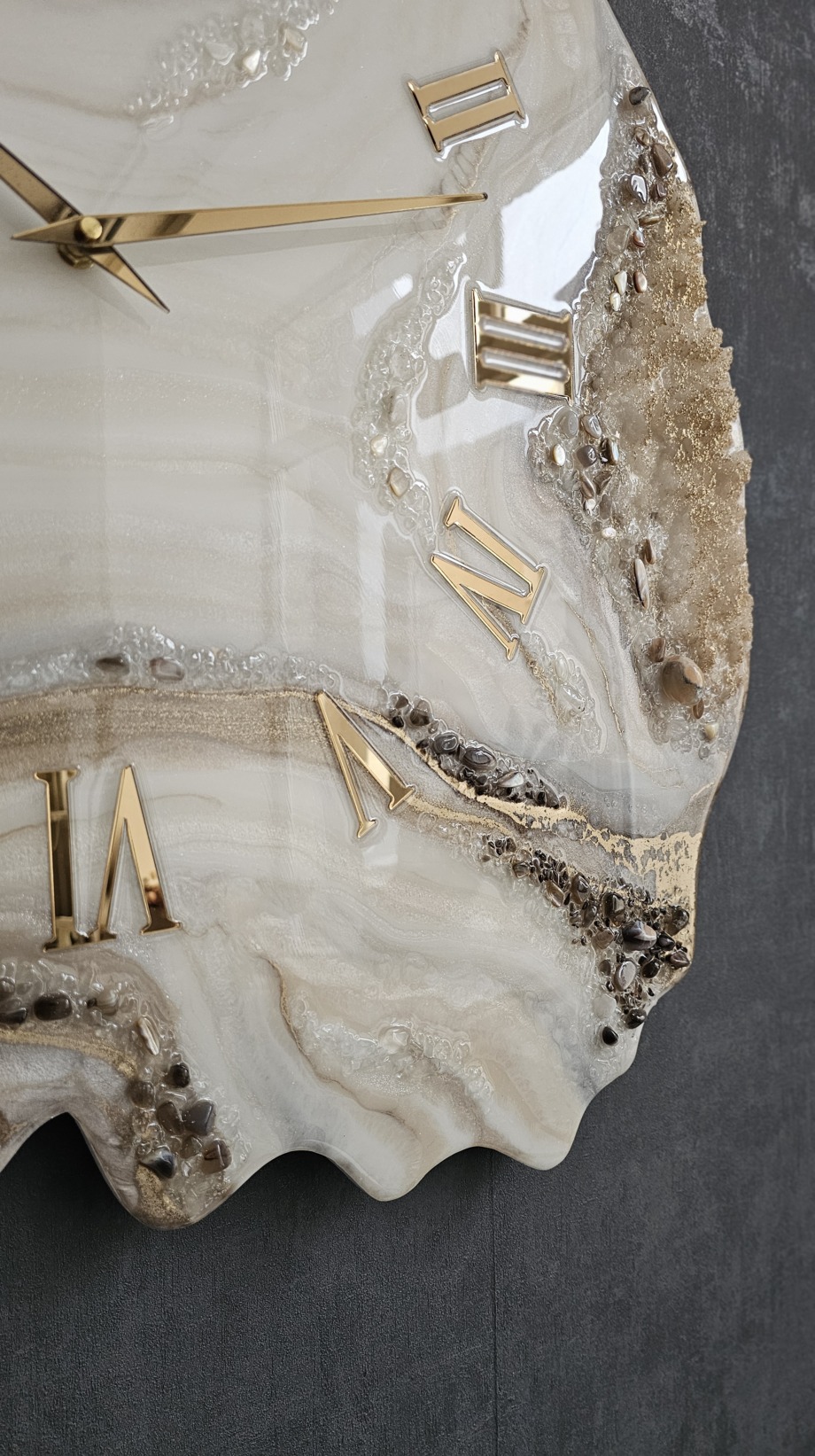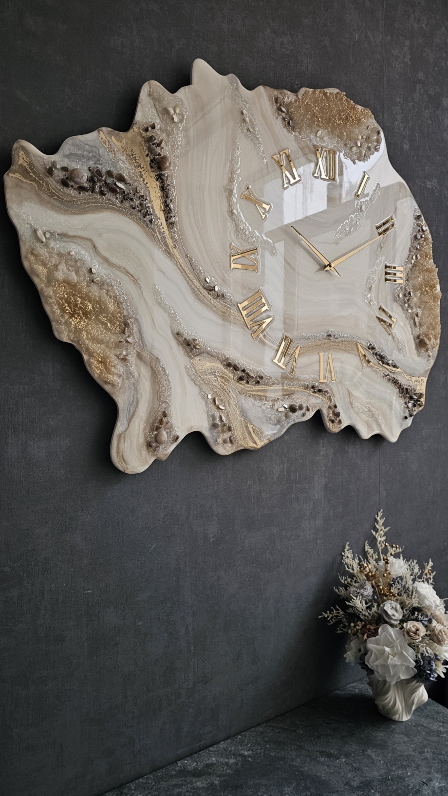 Ручная работа из эпоксидной смолы с натуральными камнями и золотыми акцентами. Форма жеоды, благородная палитра и объёмные детали делают эти часы главным акцентом интерьера.