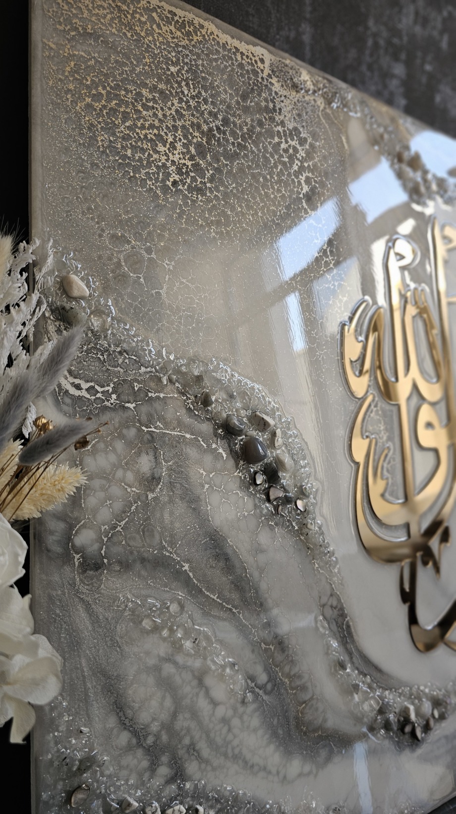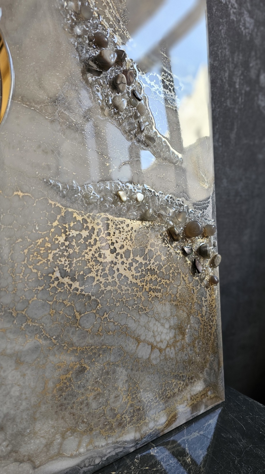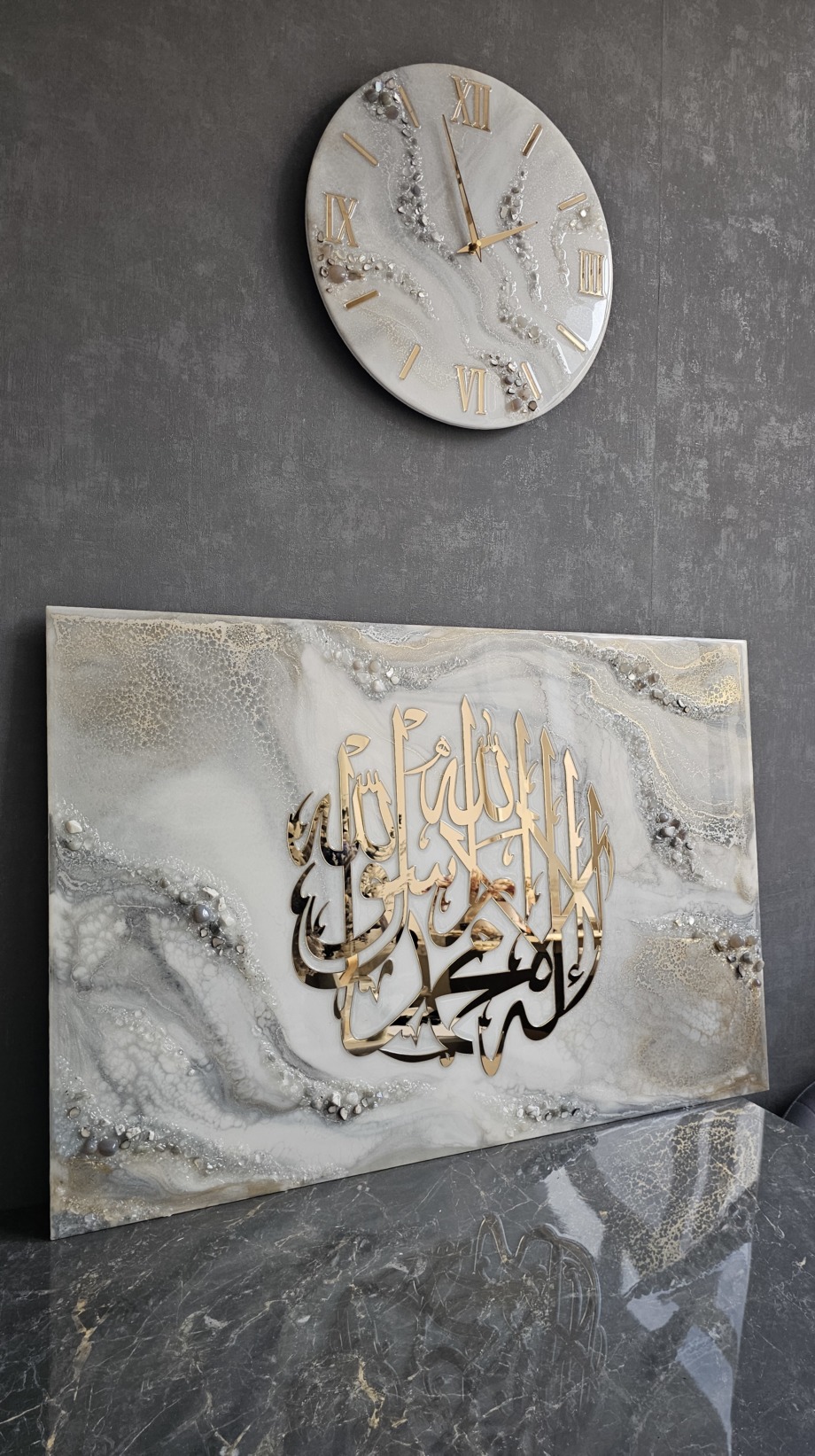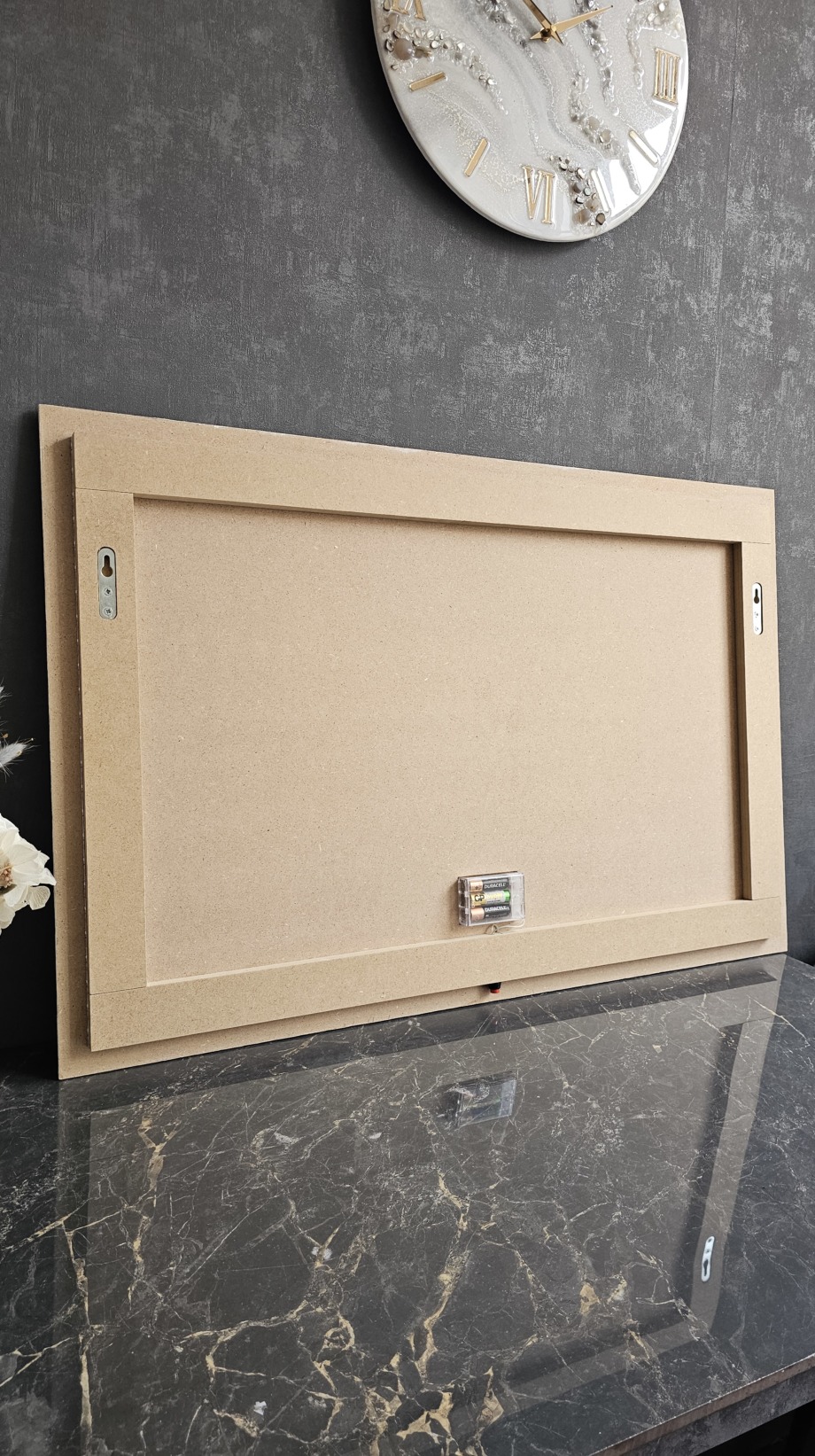 Уникальный декор интерьера в виде дуэта часы и картина с Шамаилем. Выполнен в золотисто серых оттенках под интерьер заказчицы. Дополнены подсветкой по периметру. Питание от 3х батареек типа АА.