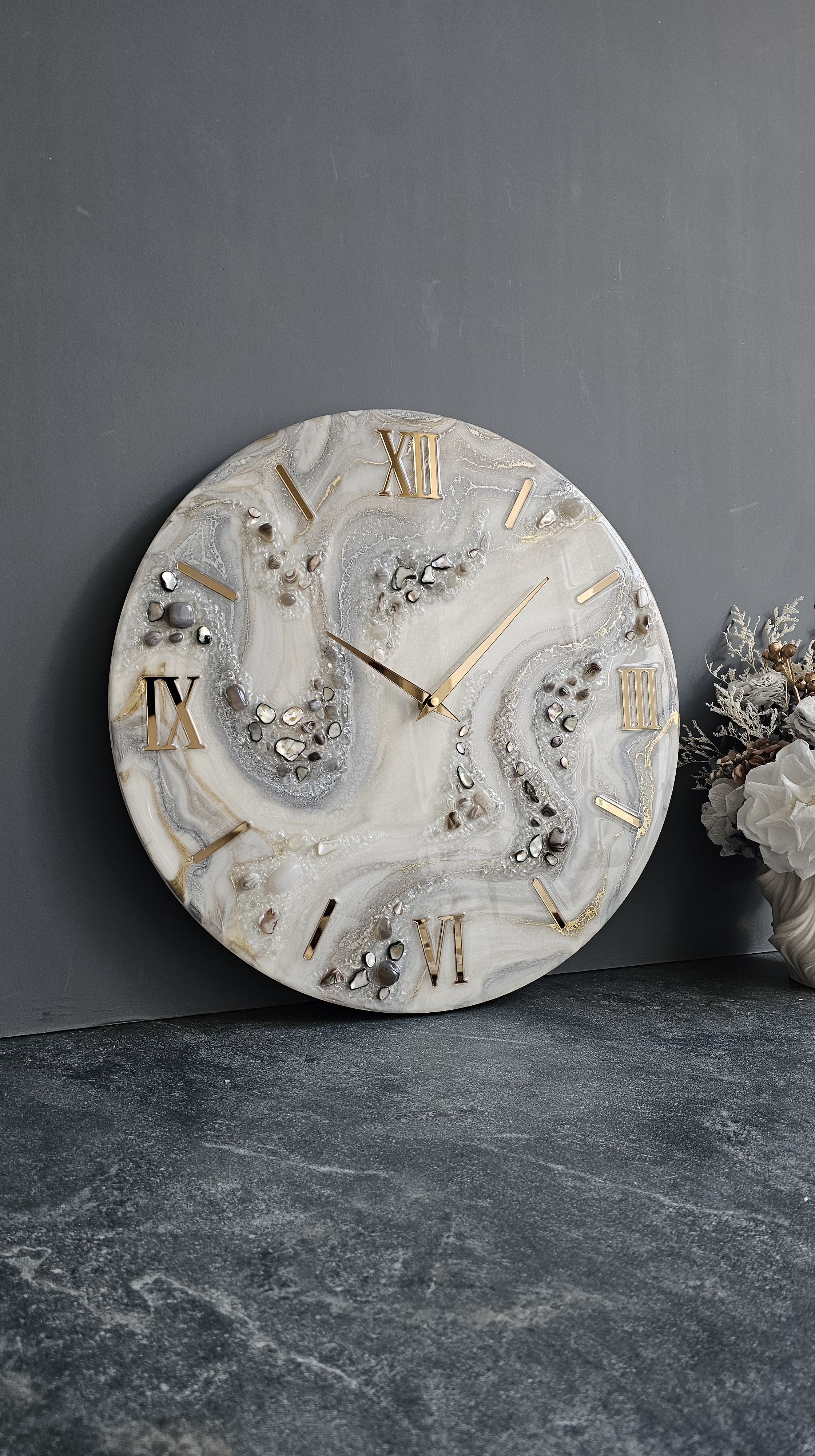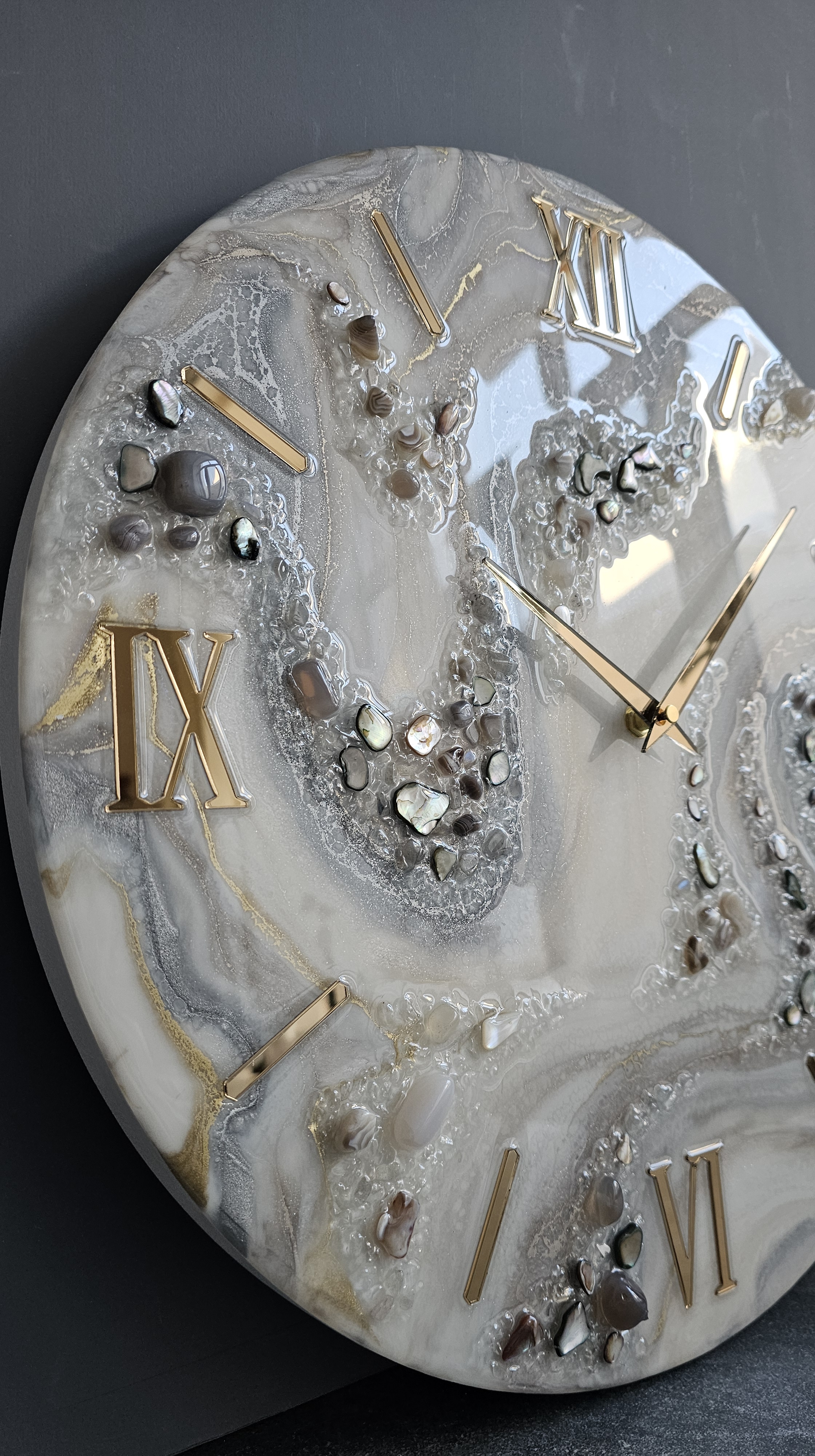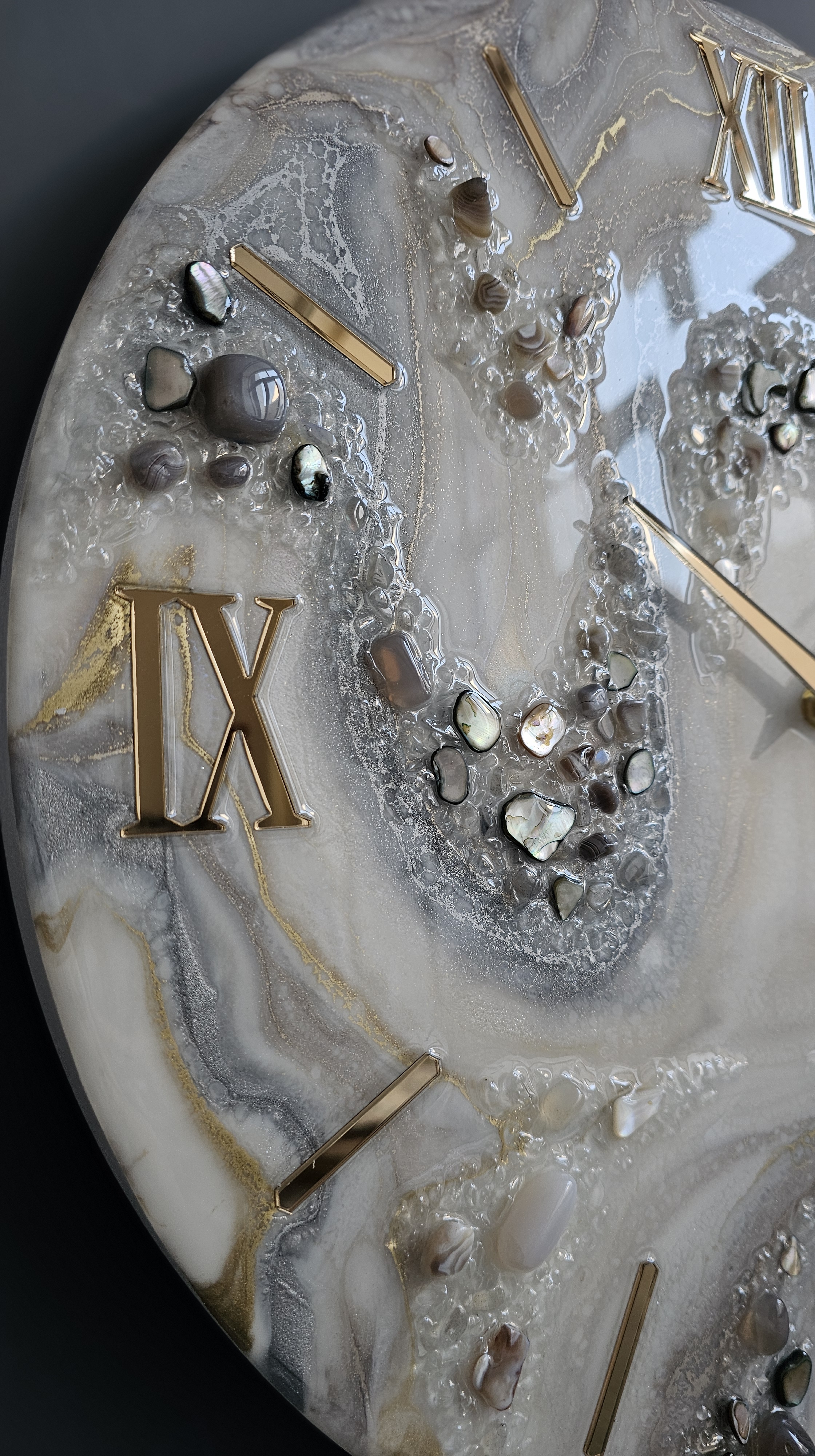 Часы из эпоксидной смолы, вдохновлённые природной красотой среза агата. Нежные переливы оттенков, плавные линии и декор натуральными камнями создают эффект настоящего каменного среза. Золотые римские цифры и стрелки добавляют элегантности и делают часы выразительным акцентом в интерьере.