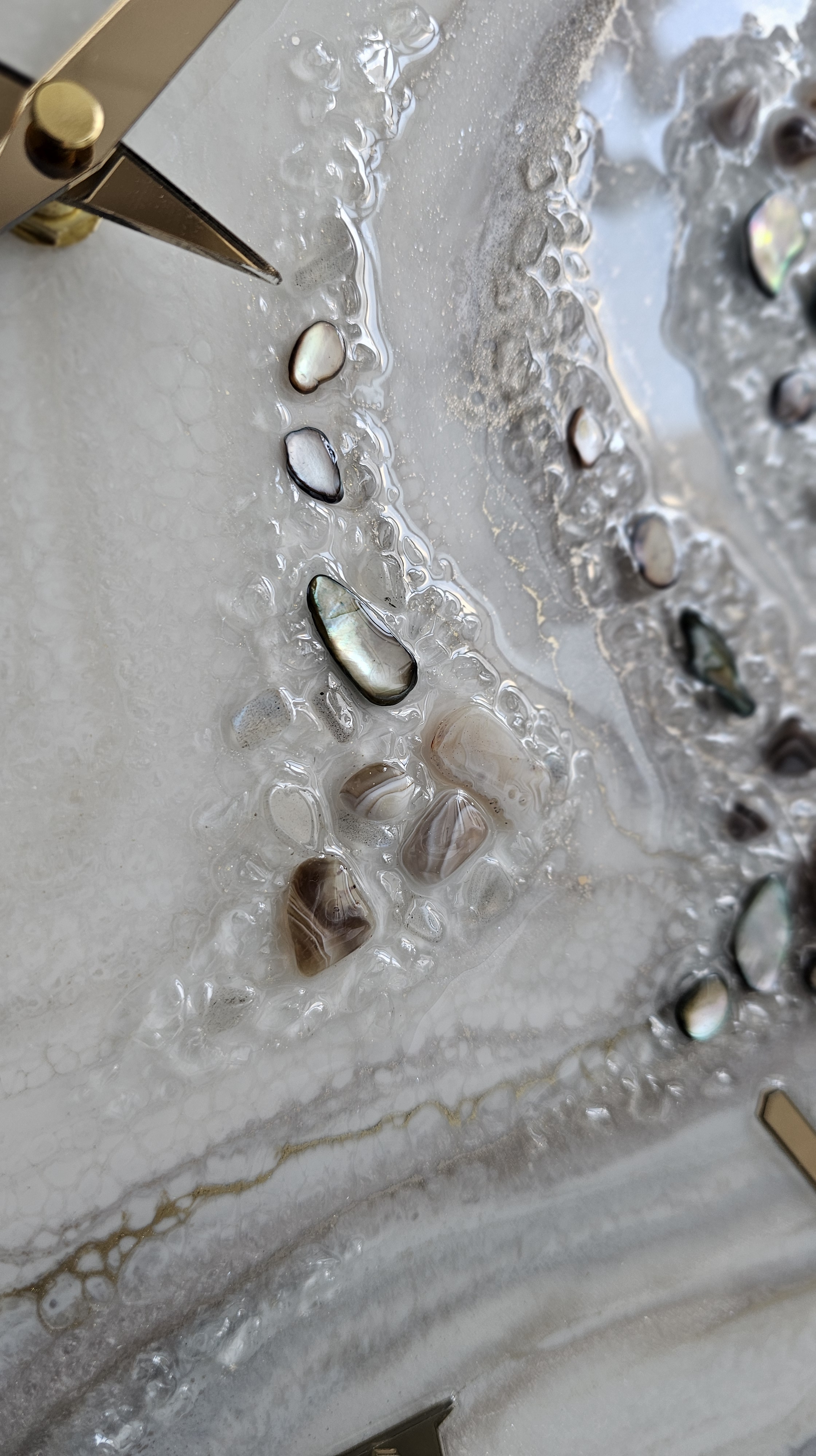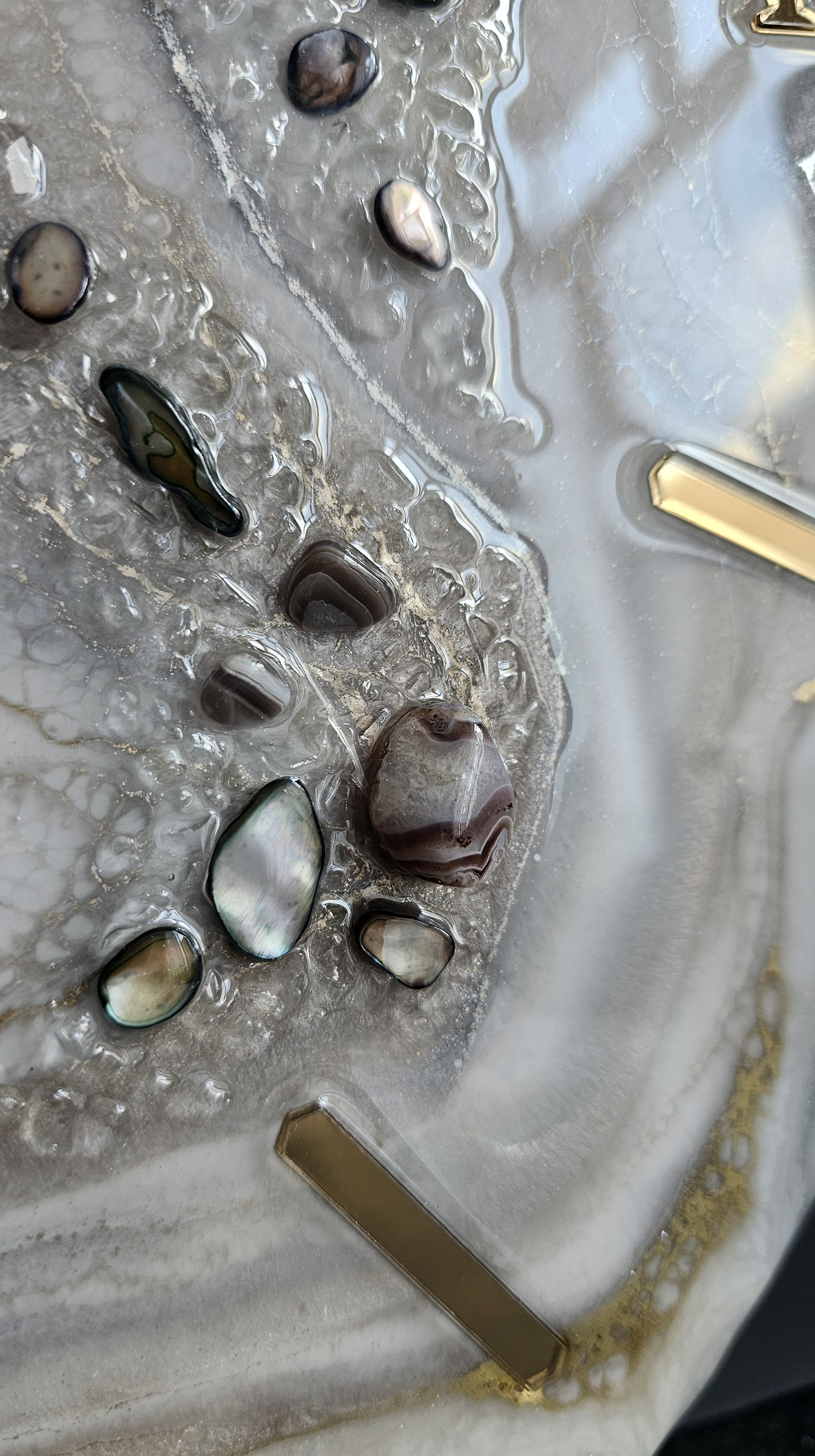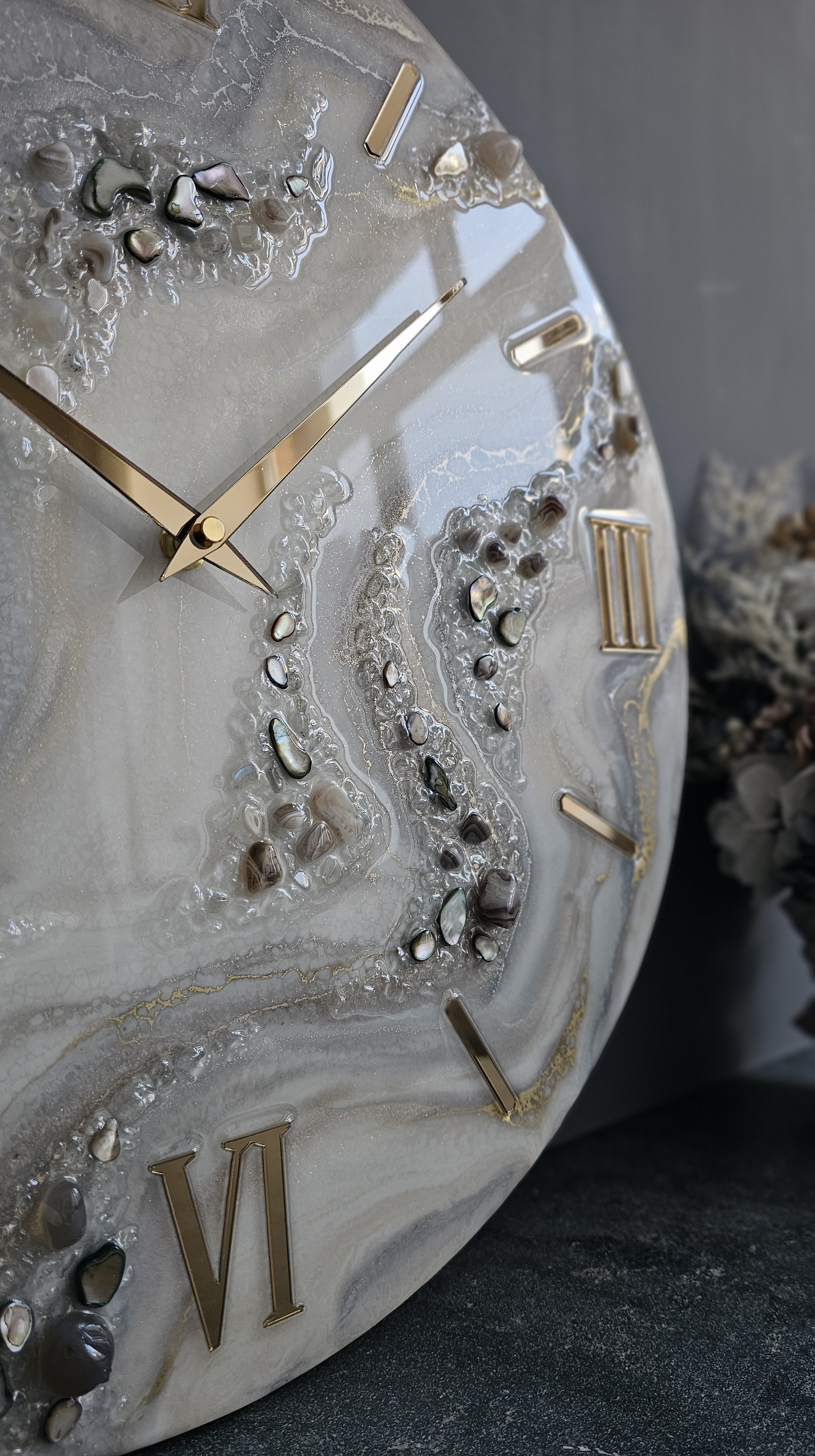 Часы из эпоксидной смолы, вдохновлённые природной красотой среза агата. Нежные переливы оттенков, плавные линии и декор натуральными камнями создают эффект настоящего каменного среза. Золотые римские цифры и стрелки добавляют элегантности и делают часы выразительным акцентом в интерьере.