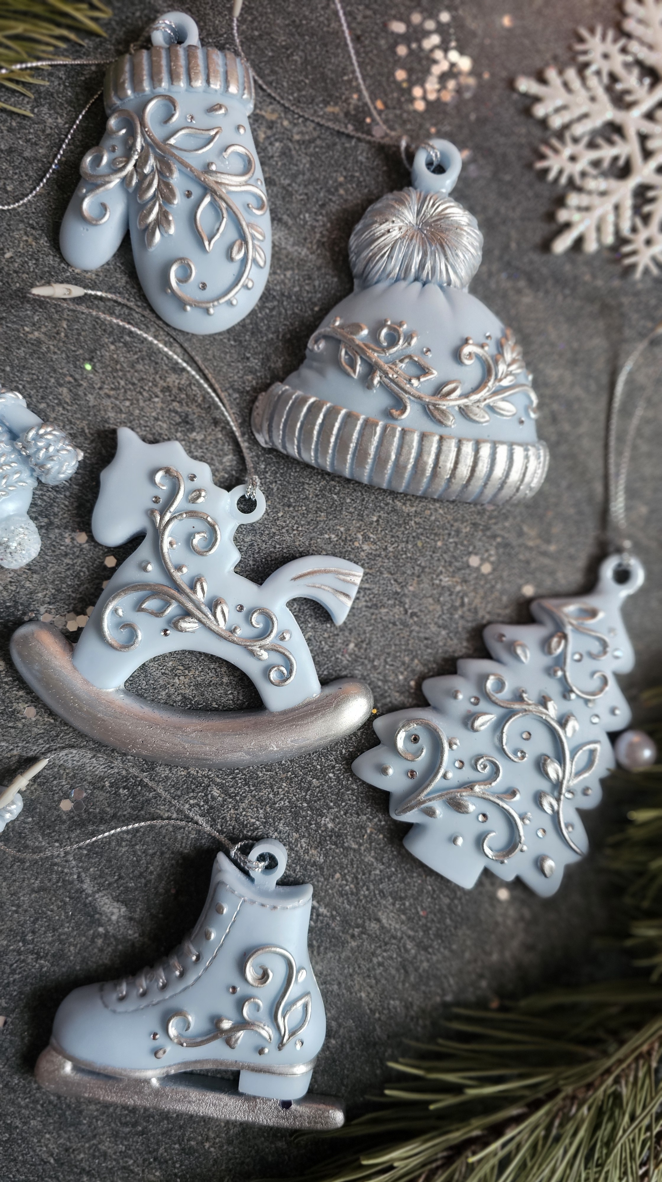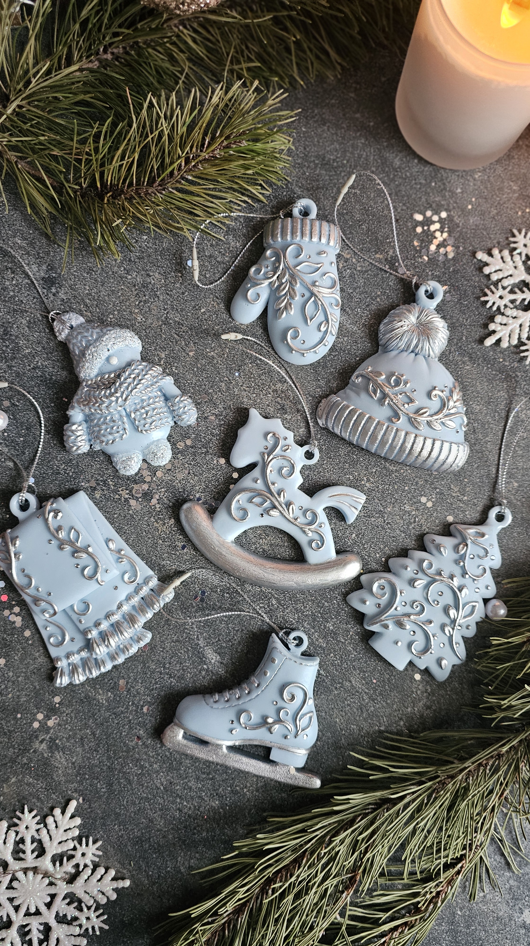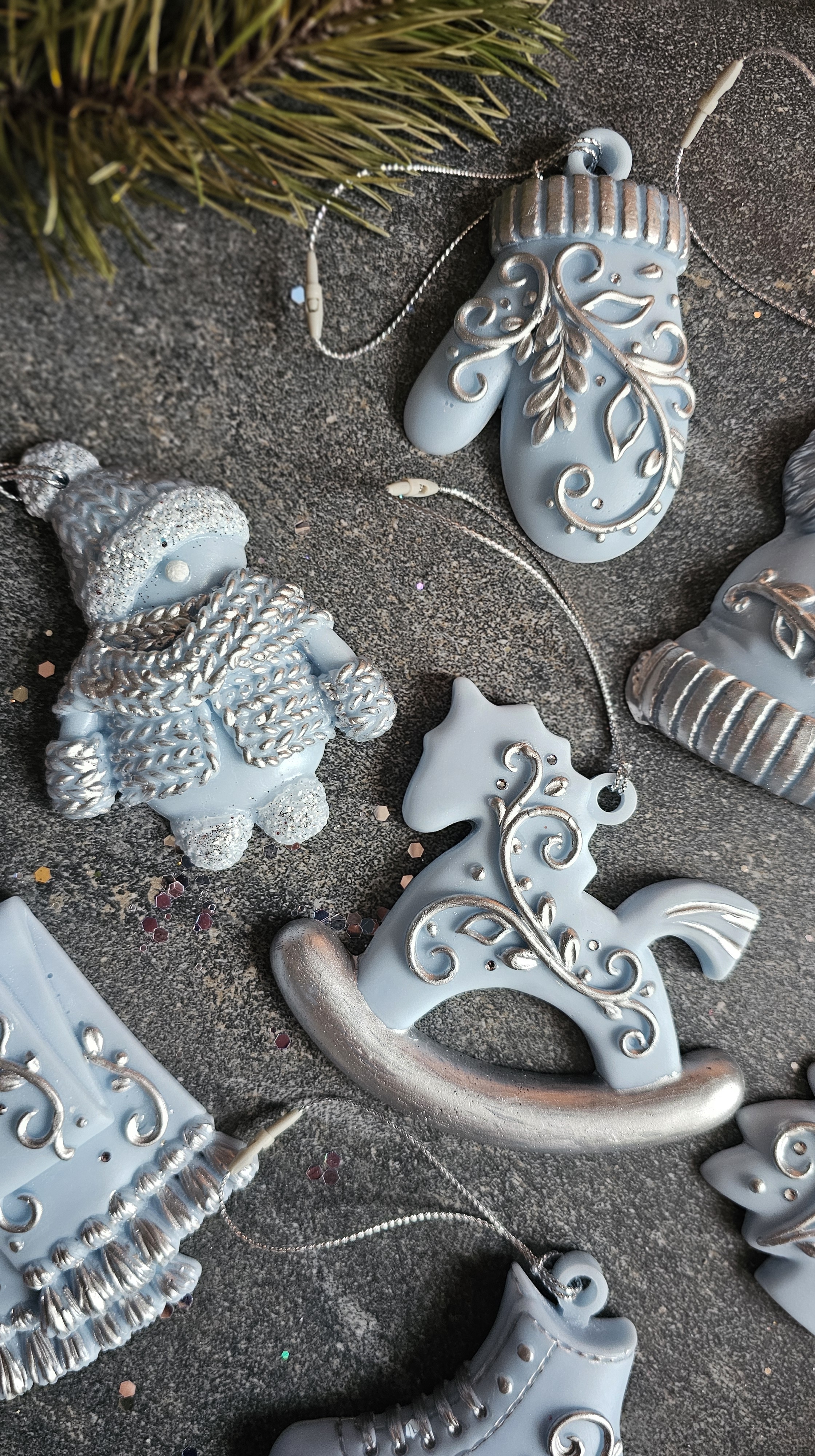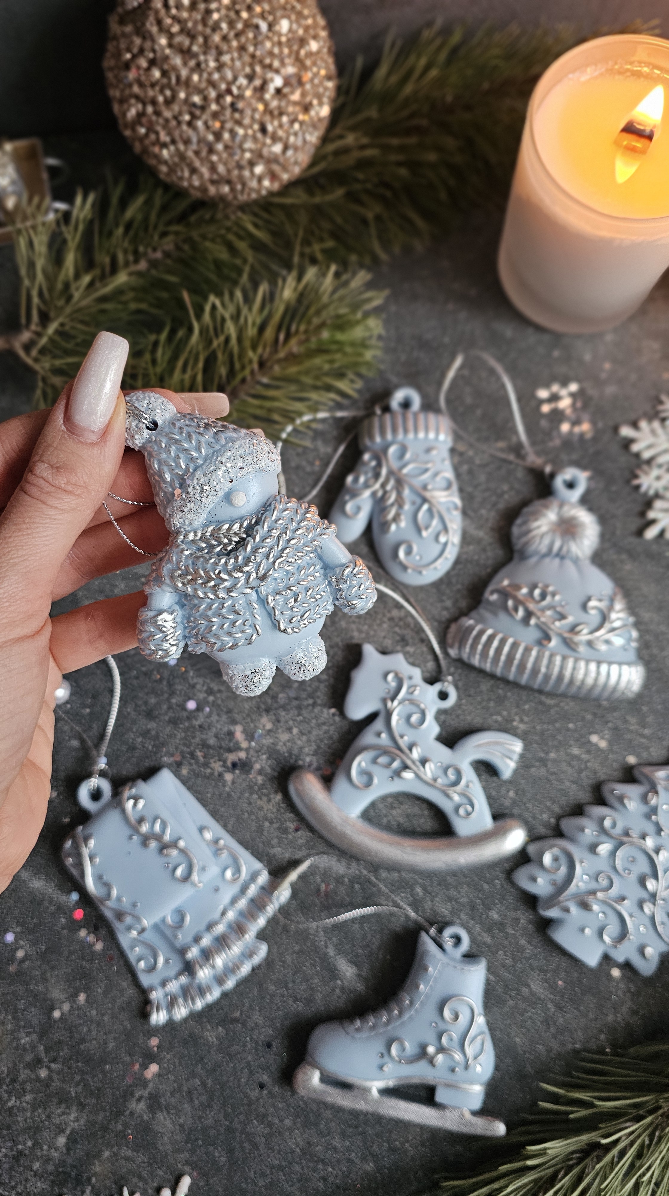 Погрузитесь в атмосферу зимнего волшебства с набором елочных игрушек «Голубой лед». Каждая игрушка выполнена из эпоксидной смолы и украшена серебристым узором, мягко мерцающим в свете гирлянд. Нежный голубой оттенок создаёт эффект морозного сияния и наполняет дом уютом. В набор входят 7 игрушек: варежка, шапочка, конёк, лошадка-качалка, снеговичок, ёлочка и шарфик — тёплые, трогательные фигурки, которые прекрасно украсят вашу ёлку. Такой набор может стать отличным подарком для близких, передающий атмосферу праздника и заботы. Каждая игрушка упакована в отдельный пакетик. Набор оформлен в подарочную крафт- коробку.